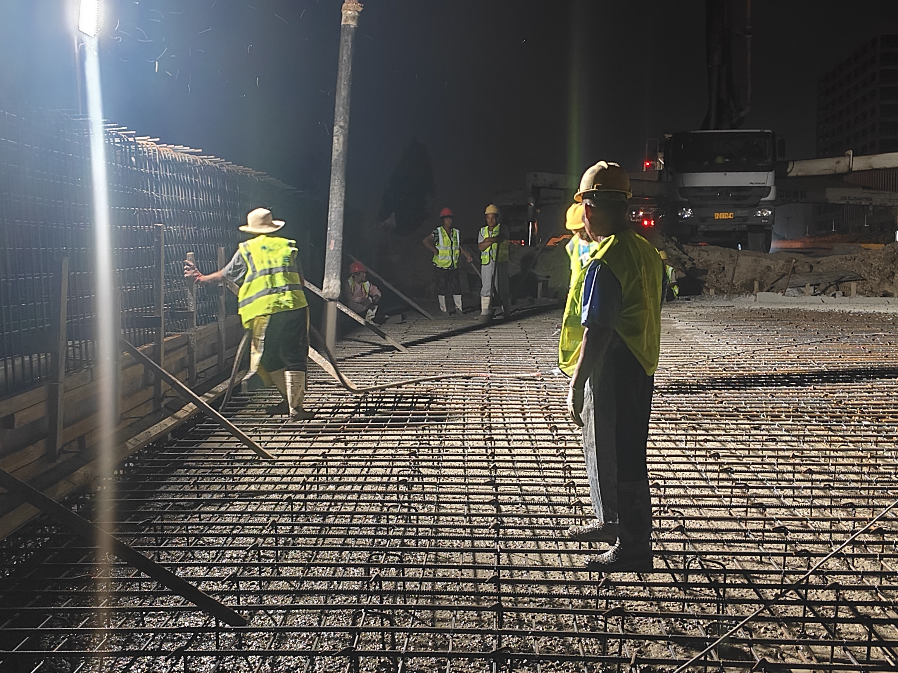 為按期實(shí)現(xiàn)臨沂物流園區(qū)西遷,保證道路暢通。項(xiàng)目部全體管理人員加大工作力度,開啟“白加黑、5+2”工作模式。白天現(xiàn)場(chǎng)檢查鋼筋綁扎、模板安裝質(zhì)量情況,嚴(yán)格按照圖紙及規(guī)范要求對(duì)鋼筋的規(guī)格、間距、搭接長(zhǎng)度、綁扎等進(jìn)行實(shí)測(cè),仔細(xì)查驗(yàn)模板拼接處是否嚴(yán)密無縫,保護(hù)層厚度是否滿足要求,嚴(yán)格控制施工質(zhì)量。夜幕降臨,工地依然燈火通明,管理人員堅(jiān)守崗位,監(jiān)督旁站混凝土澆筑、檢查混凝土運(yùn)輸單、進(jìn)行試塊留置,全力確保工程的順利推進(jìn),保證高質(zhì)量完成工程項(xiàng)目。