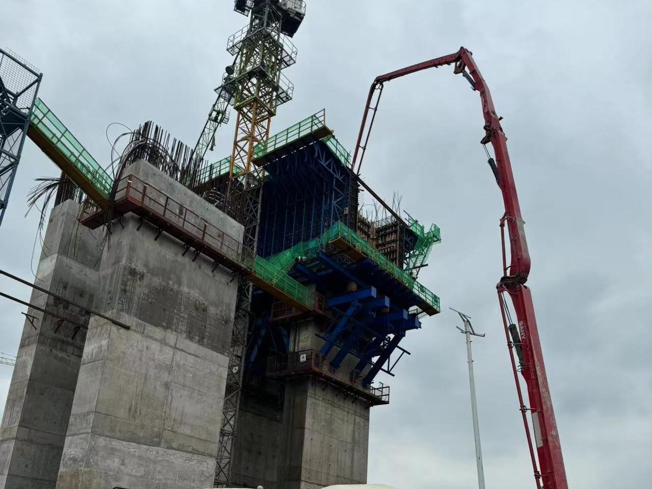 該0#塊箱梁,長12米,頂板寬達12.75米,底板寬度為6.75米,腹板80厘米,整塊梁段重達983.6噸。澆筑前,項目部制定了周密的施工計劃,由于0#塊鋼筋、鋼絞線密集,混凝土澆筑高度大,為確保混凝土澆筑質量,澆筑過程中,項目部依照“豎向分段、水平分層”的澆筑原則,遵循先底板、再腹板對稱、最后頂板的澆筑順序,嚴格遵循了托上現澆的施工工藝。1臺泵車連續澆筑,1臺泵車備用,采用水平分層的工藝,前后兩層混凝土的間隔時間不超過1小時。底板澆筑時,縱橋向先澆筑墩頂中橫梁部位,再逐漸由兩端向墩頂水平分層進行,橫橋向為兩側腹板向連續梁中間方向對稱均衡進行;腹板澆筑時,按縱向水平分層澆筑,分層厚度為30厘米,橫橋向各腹板左右相互交替連續澆筑,如此循環,直至腹板混凝土澆筑完畢;頂板澆筑時,縱橋向從懸臂端部向根部進行,橫橋向為由低到高從懸臂端向根部進行。歷時10個小時,項目建設團隊依次進行托架的搭設與底模的安裝,托架預壓和底模調整,鋼筋綁扎、模板安裝等工序,確保了工程的穩固與安全。最后,經過混凝土澆筑、養護以及預應力施工的精細操作,圓滿完成了0#塊箱梁的澆筑工作。
