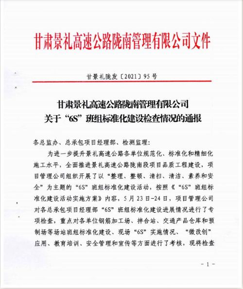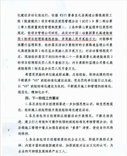 6月15日,景禮項目部在項目管理公司組織的6S班組標(biāo)準(zhǔn)化建設(shè)檢查中名列前茅,為此,項目管理公司對景禮六標(biāo)項目部進(jìn)行通報表揚,并給予獎勵20萬元。