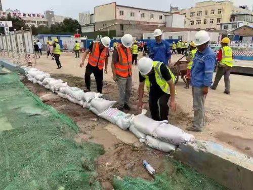 鶴壁開發區全域城市化建設項目部對施工現場生活區、辦公區和施工區進行檢查,確保排水系統通暢。由于施工現場107國道積水嚴重,為有效防范積水倒灌在建項目基坑工程,項目部準備了必備的排水機具、雨衣雨靴、編織袋和救生衣等防汛物資,組織全體管理人員在路基處設置排水溝,組織人力、物力和施工機械全力排除基坑中的積水。同時,持續24小時連續作業,用沙袋在國道處搭筑起防洪墻,確保在建工程安全度汛。