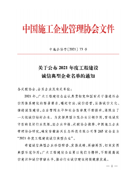 10月28日,由中國施工企業管理協會主辦的2021年度工程建設企業信用評價結果及誠信企業評選揭曉,中國二冶通過AAA信用等級年審并被授予“2021年度工程建設誠信典型企業”。