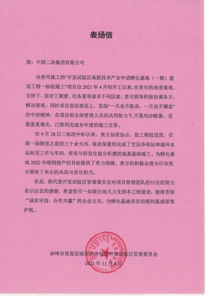 11月12日,中國二冶集團赤峰市開發試驗區高新技術產業中試孵化基地(一期)建設工程一標段施工項目收到來自赤峰市資源型城市經濟轉型開發試驗區管理委員會發來的表揚信,對中國二冶的大力支持、精心部署和項目團隊在施工過程中表現出的良好敬業精神、專業的技術能力、攻堅克難的實干精神及“用戶至上”的契約精神給予了高度肯定和贊揚。