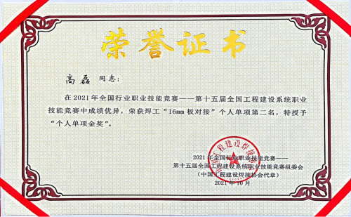 高磊表示,此次獲獎對自己是一種激勵,在今后的工作和比賽中,將繼續(xù)努力提升自己的焊接技能水平,以精湛的技藝和匠心品質(zhì)展現(xiàn)中國二冶央企實力,努力為中國二冶的高質(zhì)量發(fā)展再立新功。