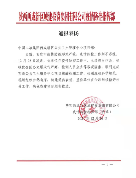 表揚信中說到,當前西安市疫情防控形勢嚴峻,疫情防控工作刻不容緩。12月25日凌晨,中國二冶西咸新區公共衛生管理中心項目部在疫情防控工作中,主動擔當作為,積極配合園辦克服天氣嚴寒、檢測人員眾多等客觀因素,順利完成西咸公共衛生服務中心項目核酸檢測工作,檢測流程科學規范,現場組織井然有序。信中還說,希望西咸新區公共衛生管理中心項目部在今后繼續做好相關工作,確保在建項目順利推進。