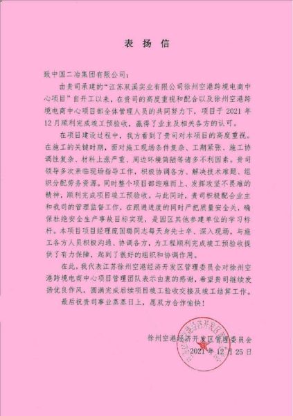 12月30日,中國二冶收到徐州空港經(jīng)濟(jì)開發(fā)區(qū)管委會表揚(yáng)信,對項目于12月25日順利完成竣工預(yù)驗收給予表揚(yáng),對中國二冶徐州空港跨境電商中心項目管理團(tuán)隊表示由衷的感謝。信中寫到,在項目建設(shè)過程中,我方看到了貴司對本項目的高度重視. 在施工的關(guān)鍵時期,面對施工現(xiàn)場條件復(fù)雜、工期緊張、施工協(xié)調(diào)性復(fù)雜、材料上漲嚴(yán)重、周邊環(huán)境簡陋等諸多不利因素,貴司領(lǐng)導(dǎo)多次親臨現(xiàn)場指導(dǎo)工作,積極協(xié)調(diào)各方、解決技術(shù)難題。同時整個項目團(tuán)隊迎難而上、發(fā)揮攻堅不畏難的精神,順利完成項目竣工預(yù)驗收,是園區(qū)其他參建單位的學(xué)習(xí)標(biāo)桿。