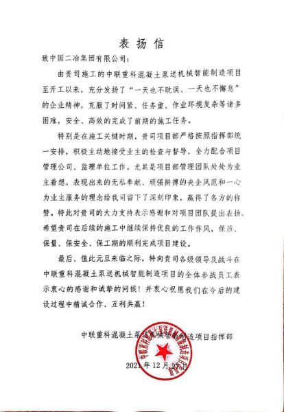 近日,中國二冶連續(xù)收到中聯(lián)重科混凝土泵送機(jī)械智能制造項目指揮部和徐州空港經(jīng)濟(jì)開發(fā)區(qū)管委會發(fā)來的表揚(yáng)信。