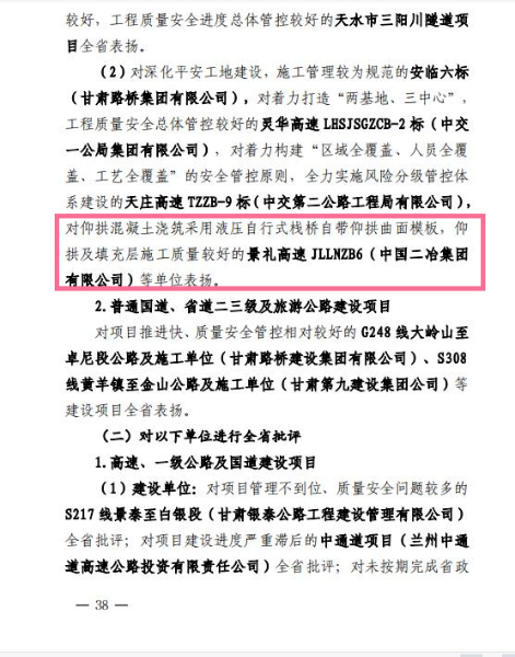 1月19日,甘肅省交通運輸廳發布《關于2021年下半年公路工程建設項目綜合督查和設計變更專項督查的通報》,對中國二冶景禮項目引進仰拱混凝土澆筑液壓自行式棧橋自帶仰拱曲面模板,較好地破解了施工的難題給予充分肯定,并給予通報表揚。