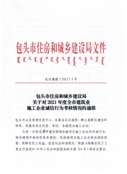4月17日,中國二冶收到包頭市住房和城鄉建設局發布的《包頭市住房和城鄉建設局關于對2021年度全市建筑業施工企業誠信行為考核情況的通報》,對中國二冶在建筑市場的誠信行為予以表揚。