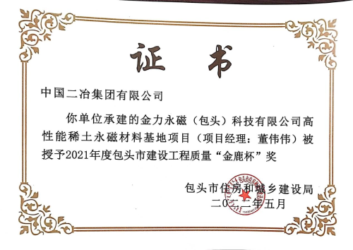 6月1日,中國二冶收到包頭市建筑業協會頒發的榮譽證書,中國二冶金力永磁 (包頭)科技有限公司高性能稀土永磁材料基地、包頭市監委留置場所、校園南路小區四期B地塊工程(二標段)3#、5#住宅樓三項工程喜獲2021年度包頭市“金鹿杯”工程質量獎。