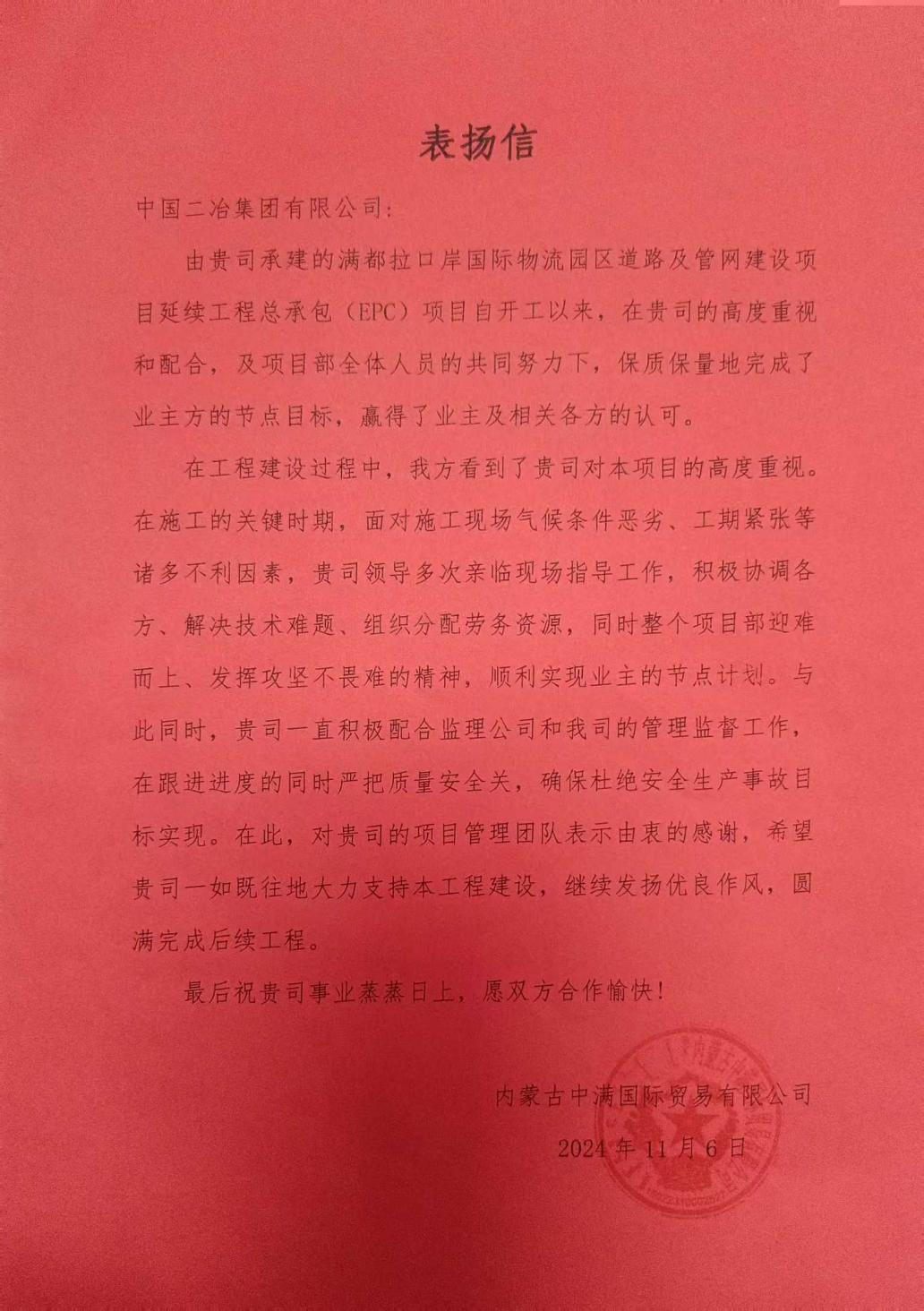 11月11日,中國二冶收到內(nèi)蒙古中滿國際貿(mào)易有限公司表揚(yáng)信,對(duì)項(xiàng)目按時(shí)限要求完成節(jié)點(diǎn)任務(wù)表示高度贊揚(yáng)與肯定。