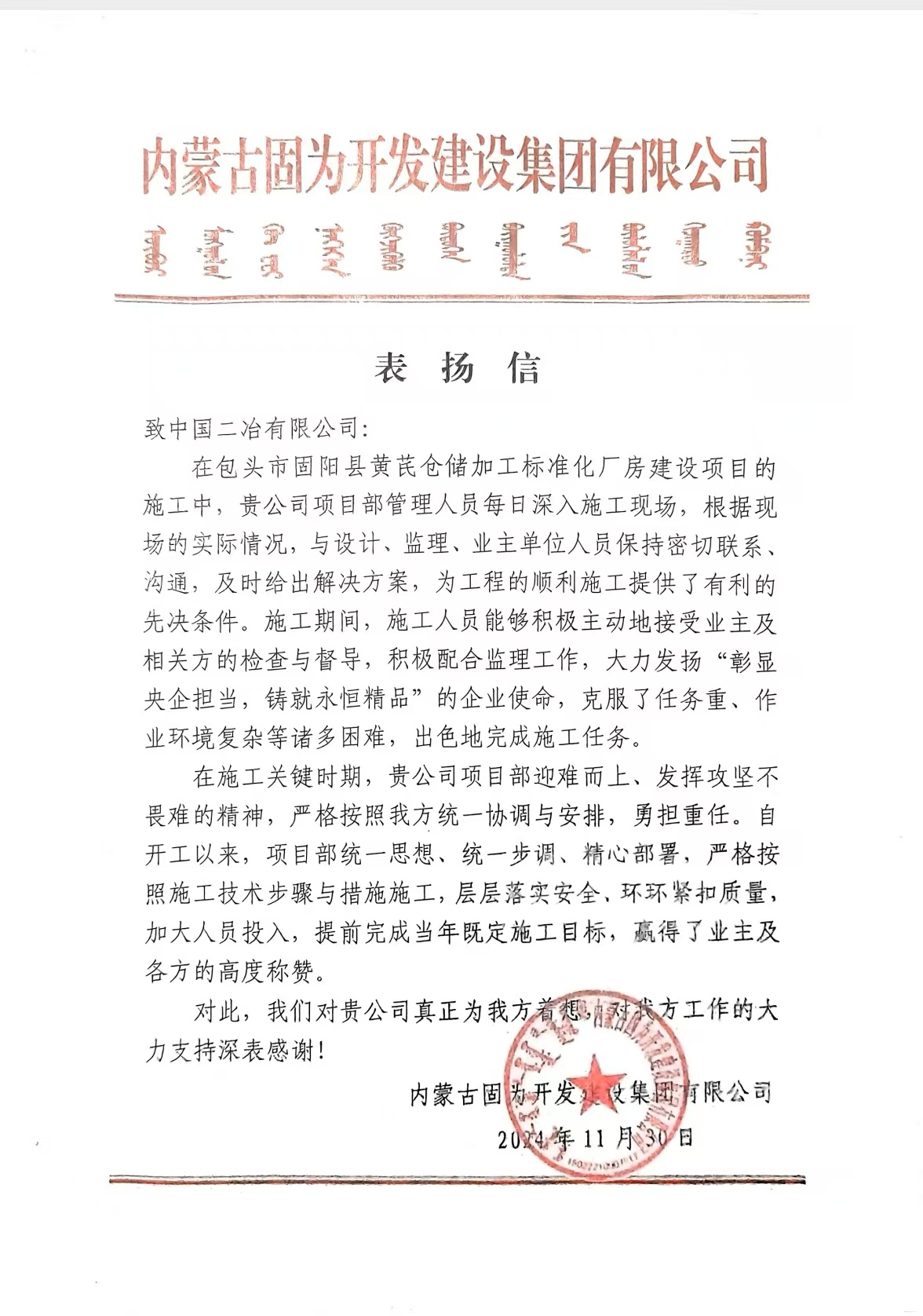 12月2日,中國二冶收到內(nèi)蒙古固為開發(fā)建設(shè)集團(tuán)有限公司發(fā)來的第二封表揚(yáng)信,高度稱贊項(xiàng)目管理團(tuán)隊(duì)提前完成固陽縣黃芪倉儲(chǔ)加工標(biāo)準(zhǔn)化廠房建設(shè)項(xiàng)目既定目標(biāo)的杰出表現(xiàn)。