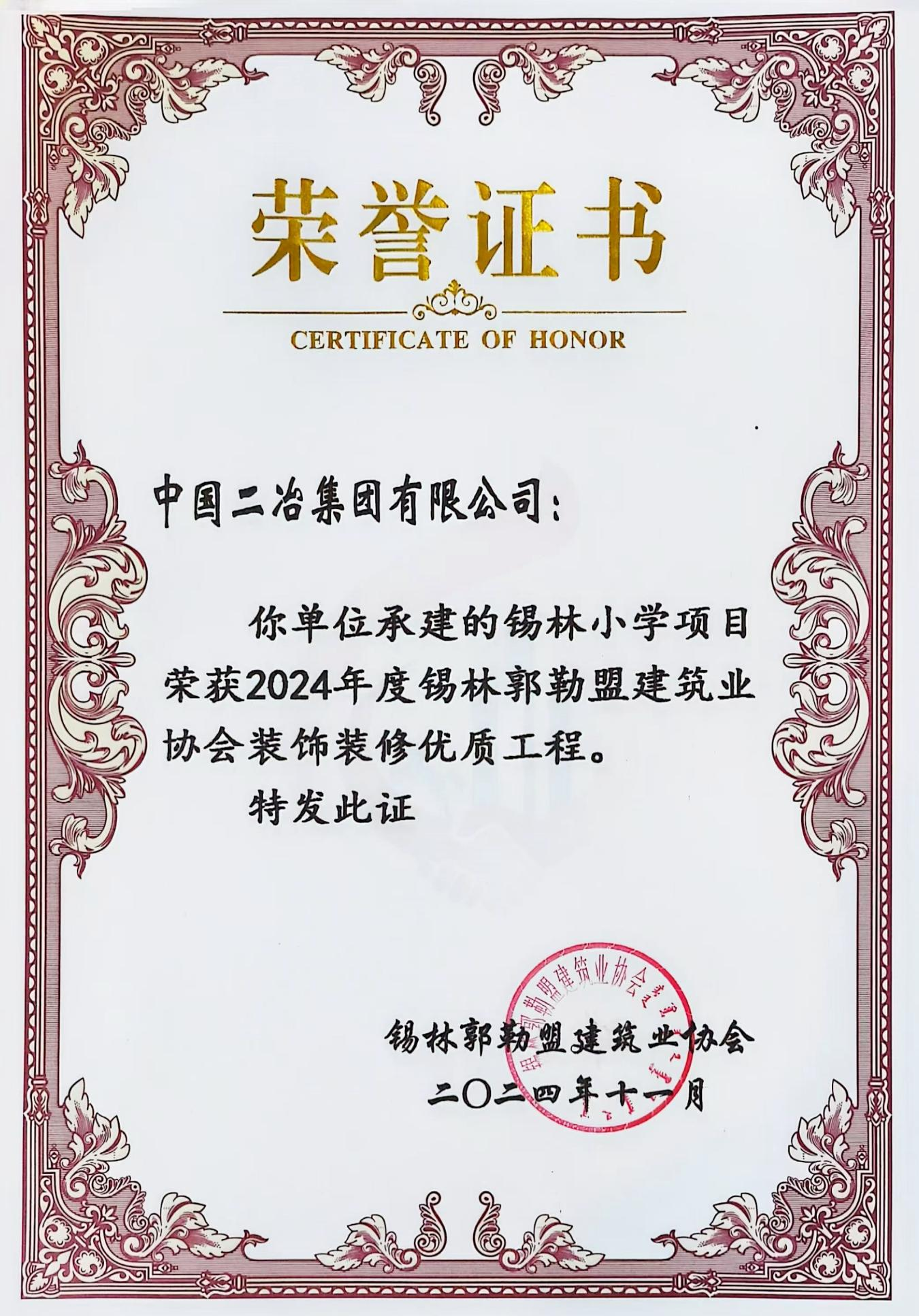 近日,中國二冶錫林小學項目獲評2024年度錫林郭勒盟建筑業協會裝飾裝修優質工程獎。