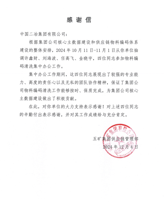 近日,公司收到中國五礦集團供應鏈管理部感謝信,對公司為中國五礦集團公司核心主數據建設做出的積極貢獻表示感謝。