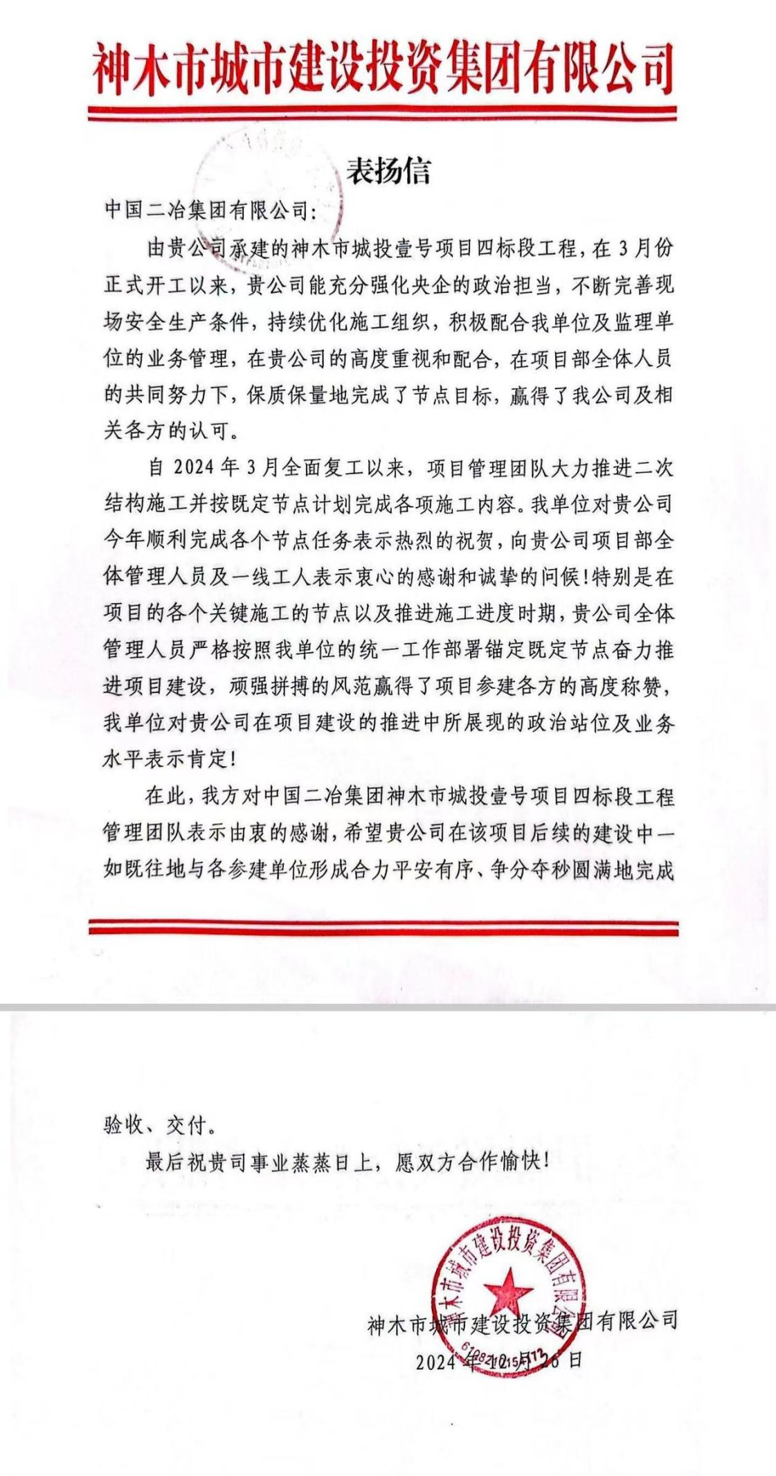 神木市城市建設投資集團有限公司在表揚信中提到:中國二冶項目管理團隊在神木城投壹號項目建設過程中充分發揮央企擔當,不斷完善安全生產條件,優化施工組織設計,保質保量完成項目二次結構及其他施工內容。神木市城投壹號項目位于神木市東興街以西,四支河路以北麟州路以東后坡路以南,總建筑面積3.5萬平方米。作為神木市重要民生工程之一,該項目從開工建設以來,全體參建人員就以“起步就是沖刺,開局就是決戰”的拼搏姿態,緊密配合,攻堅克難,嚴格按照進度計劃進行施工,做到了抓安全堅持不懈、抓質量堅定不移、抓進度毫不動搖,高質量高效率完成履約節點,用實力跑出二冶速度。