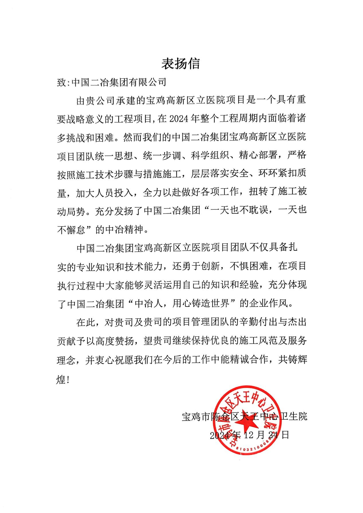 12月26日,中國二冶連續收到神木市城市建設投資集團有限公司和寶雞市陳倉區天王中心衛生院發來的表揚信。表揚信對中國二冶在項目建設過程中展現出的綜合實力表示肯定,對項目按計劃實現工期節點提出表揚。
