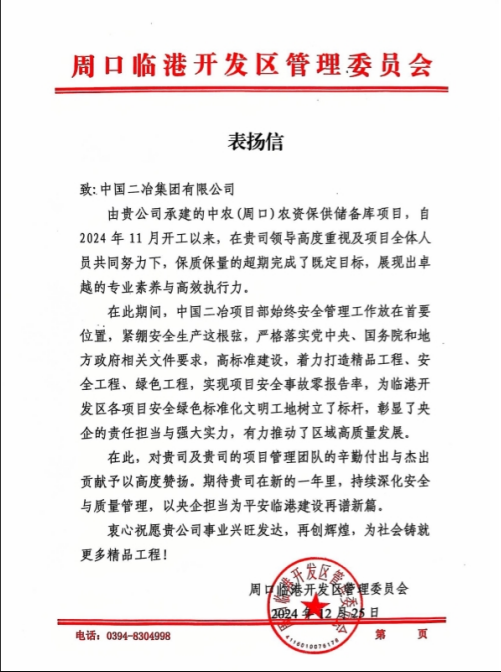 近日,中國二冶收到內(nèi)蒙古能源發(fā)電興安熱電有限公司感謝信和河南省周口臨港開發(fā)區(qū)管理委員會表揚信,對中國二冶項目管理團隊的辛勤付出與突出貢獻給予高度贊揚。