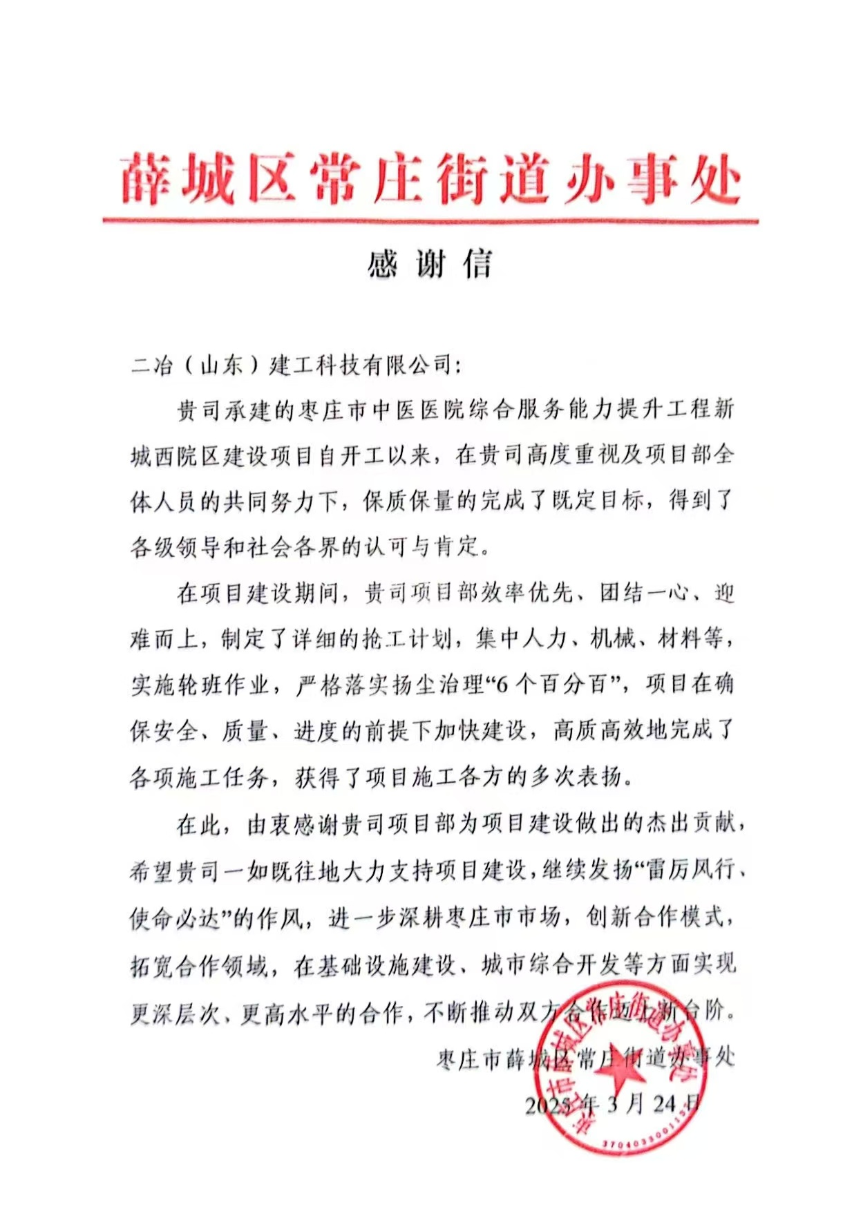 3月24日,中國二冶全資子公司二冶(山東)建工收到棗莊市薛城區(qū)常莊街道辦事處的感謝信。信中對棗莊中醫(yī)醫(yī)院項(xiàng)目自開工以來的卓越表現(xiàn)給予了極高的贊譽(yù)。