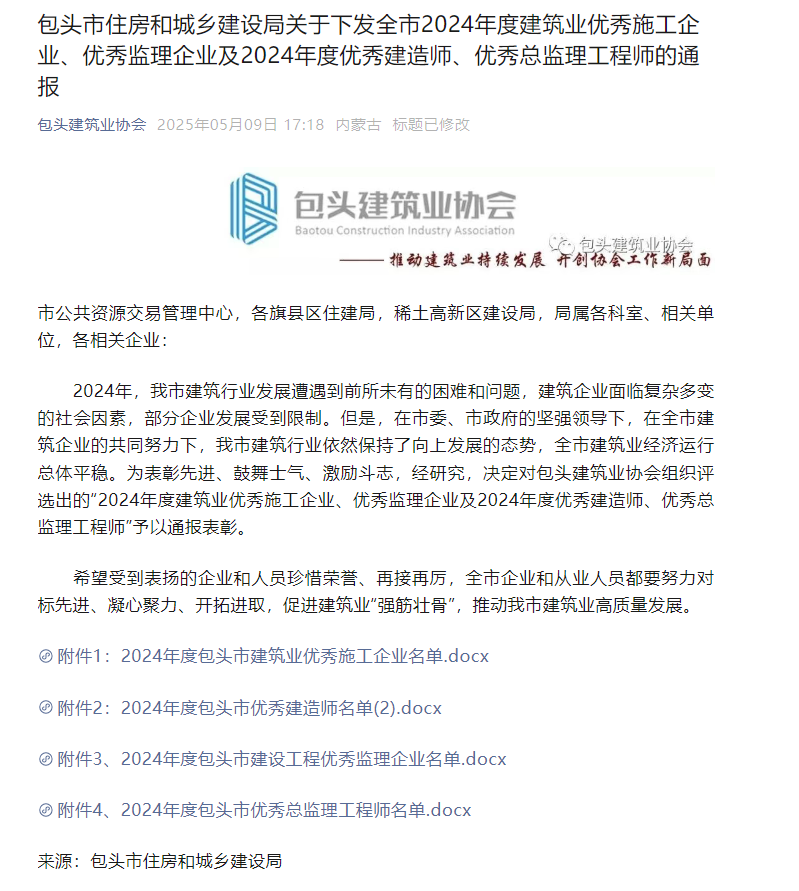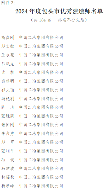 近日,包頭市住房和城鄉(xiāng)建設(shè)局通報(bào)表彰了全市2024年度建筑業(yè)優(yōu)秀施工企業(yè)、優(yōu)秀監(jiān)理企業(yè)及2024年度優(yōu)秀建造師、優(yōu)秀總監(jiān)理工程師。中國二冶獲評(píng)“2024年度包頭市建筑業(yè)優(yōu)秀施工企業(yè)”,同時(shí)30名職工獲評(píng)2024年度包頭市優(yōu)秀建造師,為公司榮譽(yù)榜再添佳績。