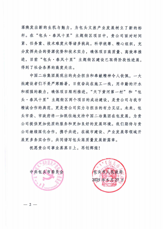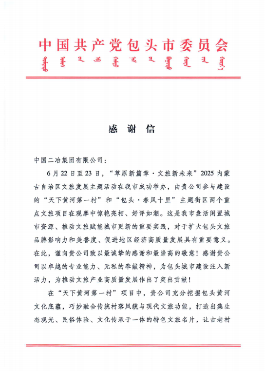 6月30日,中國(guó)二冶收到包頭市委、市政府發(fā)來(lái)的表?yè)P(yáng)信,對(duì)中國(guó)二冶在“天下黃河第一村”和“包頭?春風(fēng)十里”兩大重點(diǎn)文旅項(xiàng)目建設(shè)中作出的卓越貢獻(xiàn),給予高度贊譽(yù)。?