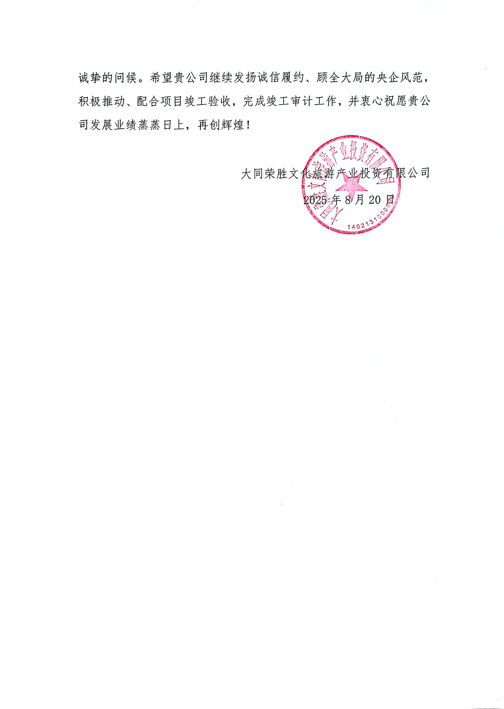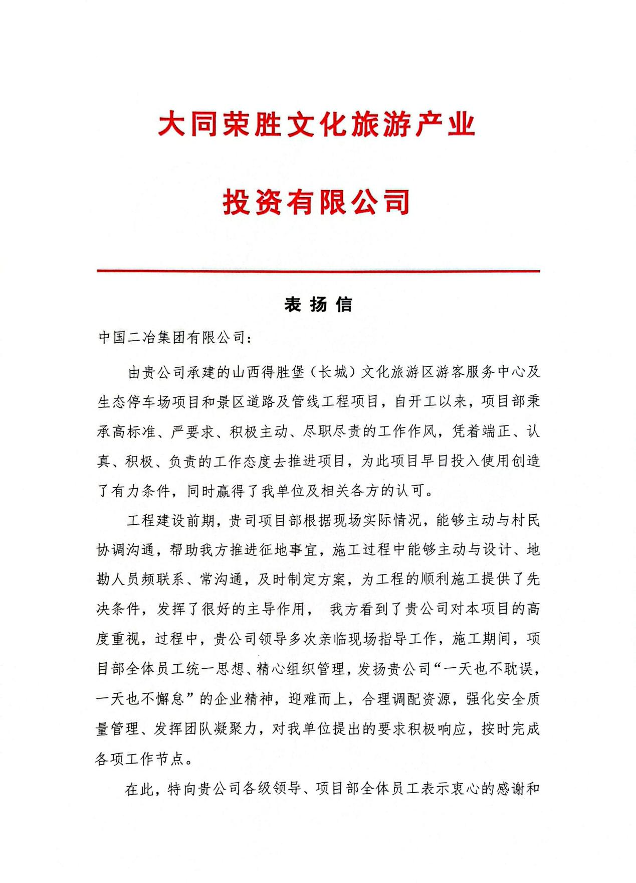 8月21日,中國二冶收到大同榮勝文化旅游產業投資有限公司發來的表揚信,信中對中國二冶內蒙古分公司在項目建設中的卓越表現給予高度認可。?